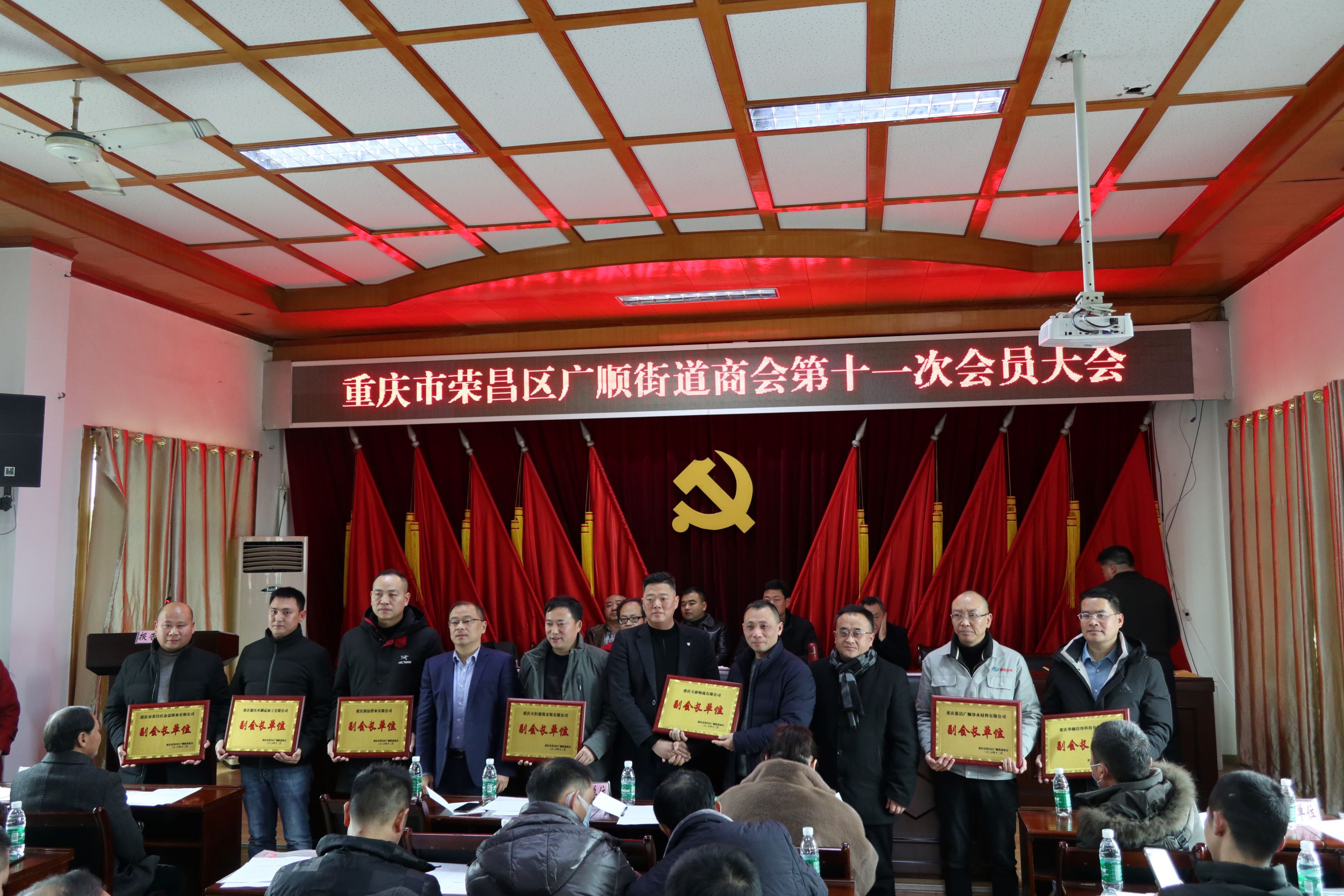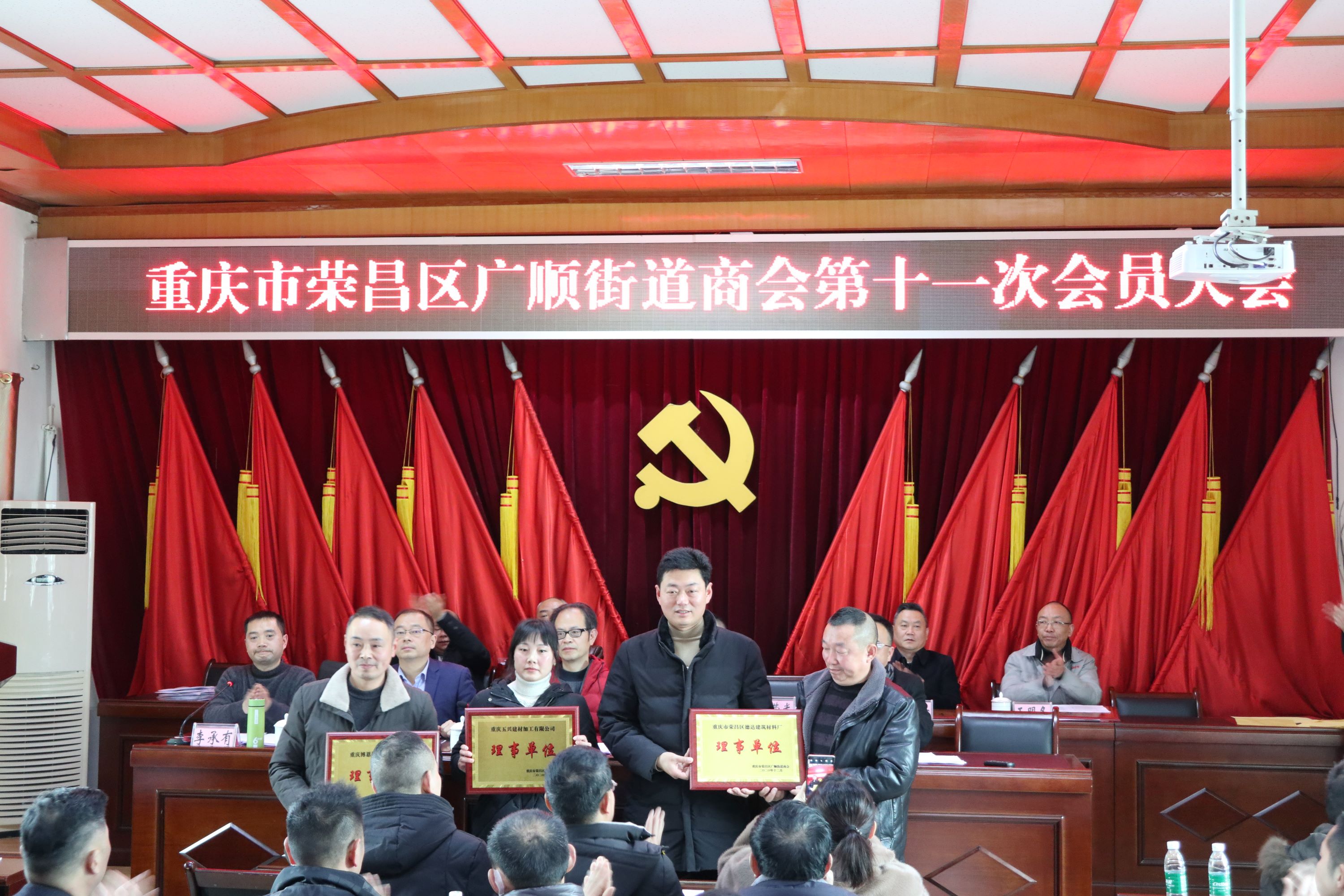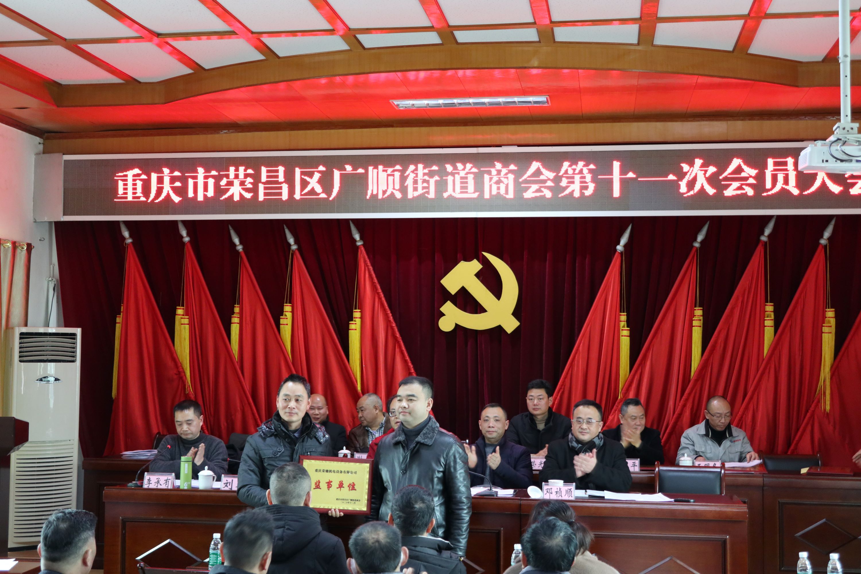 榮昌區(qū)工商聯(lián)領(lǐng)導(dǎo)、廣順街道領(lǐng)導(dǎo)分別為商會(huì)會(huì)長(zhǎng)、副會(huì)長(zhǎng)、監(jiān)事、理事單位授牌。